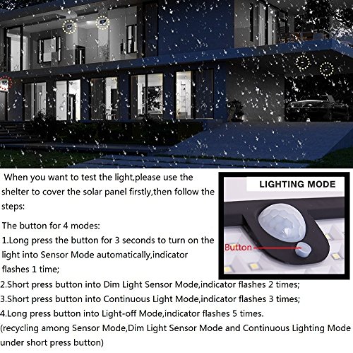 4 perfect Modes to be choosen: Full Light Mode suits for the front and back door, outdoor patio, deck area backyard;Dim Light Motion Detected Mode suits for balcony railing, side and back yard, entryway;Full Light Motion Detected Mode suits for garage, driveway, path, fence;Lighting-off Mode.
