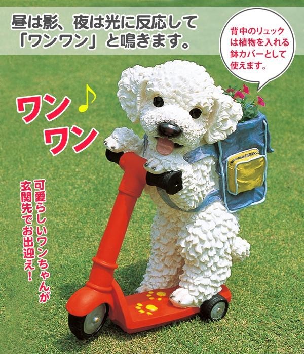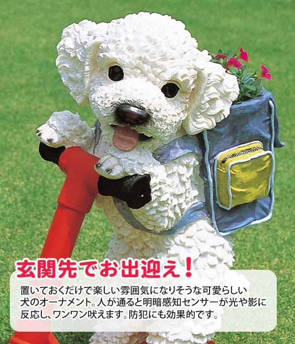 | 昼間は影に、夜間は光に反応して鳴く犬のオーナメント。玄関先などに置いてスイッチを入れておけば、防犯や来客時にも役立ちます。背中のリュックは鉢カバーとしても使えます♪ |