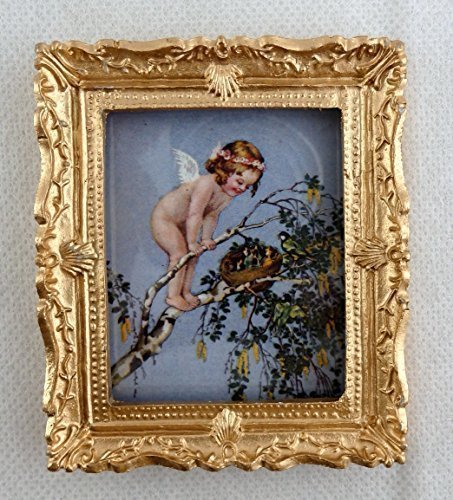 -. Title : Melody Jane Dolls Houses House Miniature Accessory Cherub & Birds Nest Picture Painting Gold Frame