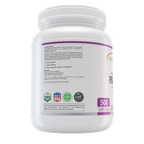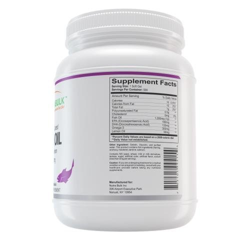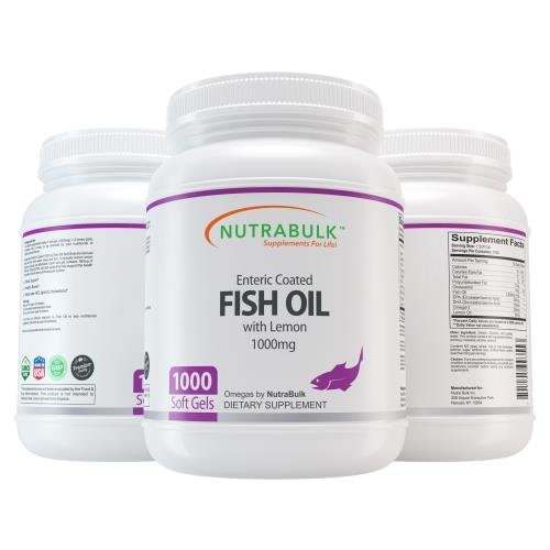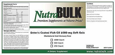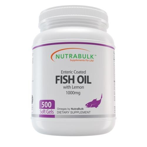 NutraBulk Enteric Coated Fish Oil 1000mg Soft Gels Loaded with Omega-3 Fatty Acids 500 Count Bottle Primary Use: To Lower Cholesterol and Improve Cardiovascular Health NutraBulk's Enteric Coated Fish Oil 1000mg Soft Gels are derived from oils from cold water, deep sea fish. (Not sourced from farm-raised fish!) Each soft gel contains 180mg of EPA and 120mg of DHA, two omega-3 fatty acids that help support and maintain the health and vitality of the human cardiovascular system. Total of 340mg of Omega-3 fatty acids. Omega-3 fatty acids are considered to be important for cellular, heart and metabolic health, and help maintain triglyceride levels already within a normal range. Our Fish Oil Soft Gels are laboratory tested to meet strict quality control standards for potency, purity and disintegration. These Fish Oil soft gels have an enteric coating that eliminate or greatly reduce the "fish oil" aftertaste or burping that sometimes occurs with regular Fish Oil supplementation by protecting the soft gel from absorption until in the small intestine. (this also enhances the bioavailablity and absorption of the essential fatty acids compared to regular fish oil soft gels) Dosage: 2-3 soft gels daily or as directed by your healthcare provider. More information about NutraBulk www.nutrabulk.comFeature