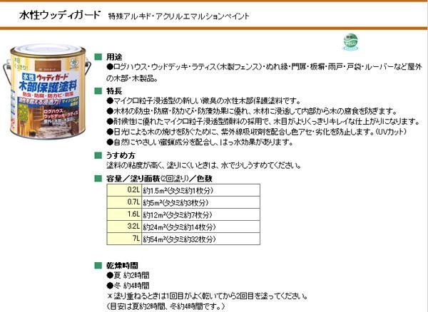ログハウス・ウッドデッキ・ラティス(木製フェンス)・ぬれ縁・門扉・板塀・雨戸・戸袋・ルーバーなど屋外の木部・木製品にお使いいただけます。 製造国:日本 素材・材質:特殊アルキド・アクリルエマルションペイント 内容量:0.7L※お届け地域により、別途運賃がかかる場合やお届けできない場合がございますので、お問い合わせ下さい。