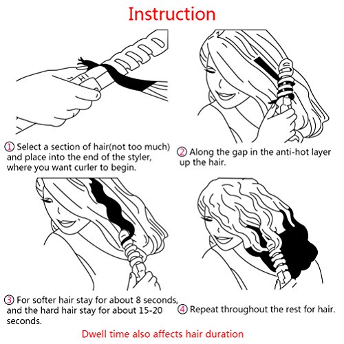 Best modeling time: 1-2 minutes (this product is constant temperature, warm fast, the plug after 30 seconds can curl, 1 minutes can start to curl) Product temperature:80-220 degree(constant temperature,and after plug,its temperature will gradually rise to the highest) Attention:1.Before styling,the washed hair should be completely dry and combed thoroughly.Divide your hair in strands with a comb.
