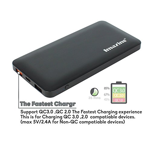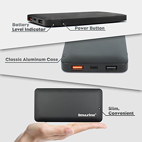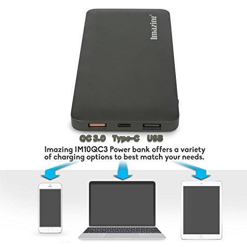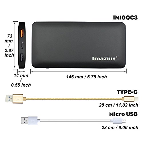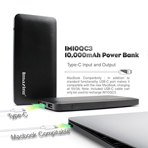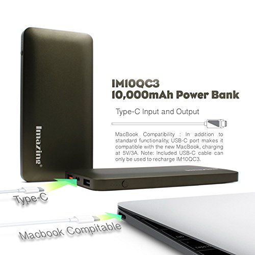-. Binding : Wireless Phone Accessory -. Brand : Imazing -. Feature : Imazing 10000mah Power Bank with High Quality Aircraft type Aluminum alloy housing. High End Design for the present of High End Mobile phone device and Laptop / Qualcomm Quick Charg 3.0 is Just Better Than 2.0: Compared to QC 2.0, QC 3.0 has 15% greater charging efficiency, charges up to 27% faster, and reduces power consumption by up to 45%. Quick Charge 3.0 offers a more granular range of voltages: 200mV increments, from 5V to 12V. eg 5.2v, 5.4v, 5.6v, 5.8v, 6.0v,6.2v ....... 11.8v etc / Type-C Input and Output 5v/3A Optimized charging/discharging efficiency Up to 93% conversion rate 10000mAh high capacity lithium battery, full charging time for 10000mah using 5V/3A is only about 4 hours , can using Apple type-c to type-c cables able to power Apple Mac Book (tested and supported) with USB-C / Type-C ports. / Safe to use. Supports over-charged, over-discharged, over-voltage, over-current and short circuit protection, perfectly protects your digital devices from charging accident. Imazing Control board using import IC such as Japan Seiko, MuRata , Samsung and NEC MOS...etc / Compatible Qualcomm Quick Charge 2.0 & 3.0: Charges compatible devices up to 75% faster. Get up to 8 hours phone use from just 15 minutes charging! Perfect for Galaxy S6 / Note 4 / Edge, LG G4, Nexus 6, HTC M9 / M8 and more. (Not compatible with 2015 Moto X or Motorola Droid Turbo 2). All iPhone/iPod/iPad with Lightning Connectors (including iPhone 5 5s 6 6s 5SE) And All Android Phones (including Samsung Galaxy S7 S6 Edge S5 S4 S3, Note5 Note4 Note3) -. Label : Imazing -. Manufacturer : Imazing -. Model : IM10QC3 -. PackageQuantity : 1 -. ProductGroup : Wireless -. ProductTypeName : WIRELESS_ACCESSORY -. Publisher : Imazing -. Studio : Imazing -. Title : Imazing 10000mah Qualcomm Quick Charge 3.0 Type C 5V/3A input & output Power Bank Portable Charger External Battery Pack 3A + 3.0 5V 9V 12V