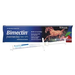 Studio : Bimeda Animal Health, Inc Publisher : Bimeda Animal Health, Inc Binding : Misc. Product Description Contains 1.87% ivermectin. For use in horses of all ages, including mares at any stage of pregnancy, for the treatment and control of large and small strongyles, pinworms, ascarids, hairworms, large-mouth stomach worms, bots, lungworms and threadworms. Apple-flavored. Each syringe treats up to 1,250 lbs body wt. 0