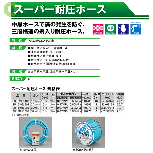●スペック:内径15mm×10mカット 使用温度範囲/0~60℃ 耐寒性/脆化温度-39℃ 耐圧性/環境温度23℃時 0.87MPa 環境温度60℃時 0.60MPa