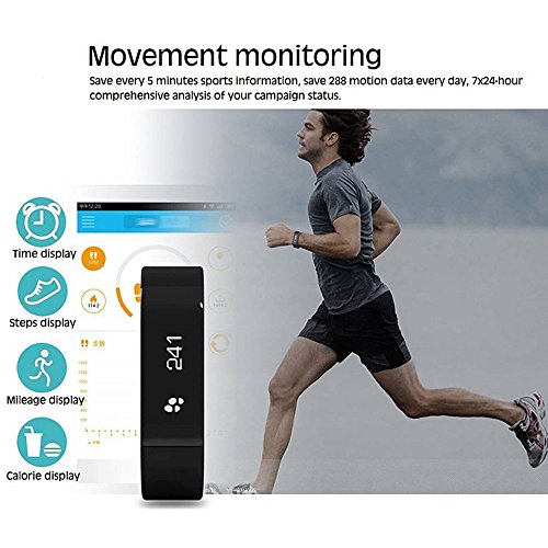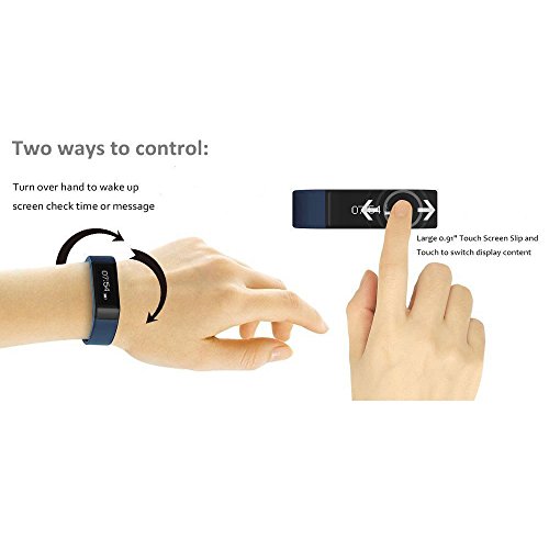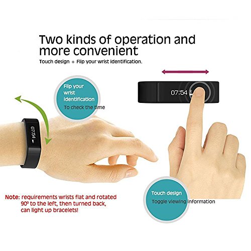 -. Feature : Touch Screen Control & Gesture Control - Two kinds mode operation and more convenient, big 0.91" touch screen design to toggle viewing information, gesture control design can flip your wrist identification, requirements wrists flat and rotated 90 degree to the left, then turned back, can light up bracelets / Movement Monitoring - Save every 5 minutes sports information, save 288 motion every day, 7*24 hours comprehensive analysis of your campaign status / Sleep Monitoring & Alarm Clock - Bulit-in slent vibration mode, a silent remind alarm that gently vibrates to remind you at your desired time without disturbing your partner Sleep Monitoring & Sleep Remind & Get Up to Remind / Caller ID and Message Display - Caller ID & Skype Reminder & Facebook Reminder & SMS Alerts, show your contact name of phone book, when you have calls or SMS, the smart bracelet will vibrate to remind, you will never miss any incoming call with call reminder. Note: The function is only for brand smartphones, such as iPhone, Samsung ,HTC, LG ( iOS 7 or above version, Android 4.3 or higher version, bluetooth must be V4.0 ) / Looking for Mobile Phones - Bracelet is connected to your phone, long press band button until vibration time, cell phone alerts are sent