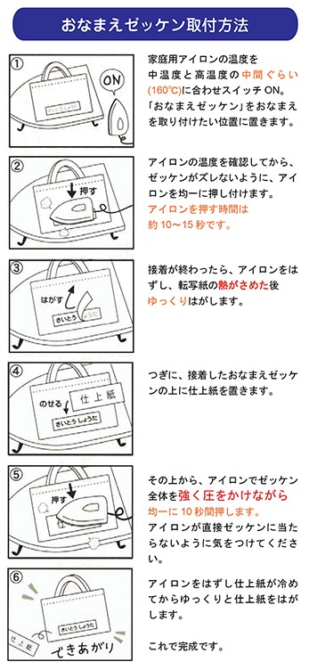お名前を付ける位置に「おなまえゼッケン」をのせ、上から家庭用アイロンで押さえて接着すれば出来上がりです。