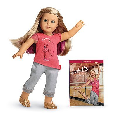-. Feature : Includes 1 Isabelle Doll, 1 Paperback Book, 1 Hair Extension, and 6 Earrings / Meet Isabelle, our Girl of the Year! She's an inspired dancer who discovers her own way to shine. The 18" Isabelle doll has sparkling hazel eyes that open and close, and long blond hair styled in double-twists for dance class. Your girl can even add a pop of color with special pink-tipped highlights that she can attach to Isabelle's hair! / The Isabelle doll comes in an outfit that shows her love of dance and design! A sequined coral tee with a glittery ballerina graphic and mesh tutu, metallic denim pants with knit cuffs, golden dance shoes, coral underwear, and classic silver earrings! The 18" Isabelle doll has a hable cloth body, and her movable head and limbs are made of smooth vinyl. / The Isabelle doll has her ears pierced already / 18" tall