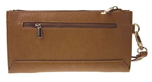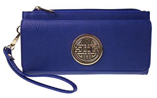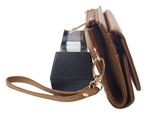 -. Feature : Features: 1 back zip-closure pocket; front meganic snap opens tri-fold compartment: 6 credit card slots, 1 slip slot. Zip top closure opens main compartment: 1 inner zipper pocket, 6 credit card slots. / Strap: 1 detachable 8.5" wrist strap. / Material: Hard quality PVC synthetic leather, solid-colored fabric lining, gold-tone hardware. / Exterior measures: 4.5"H x 8"W x 1.5"D / NOTE: ALWAYS REFER TO MEASURES BEFORE MAKING PURCHASE BECAUSE PICTURES MAY CONFUSE YOU THE REAL SIZE!