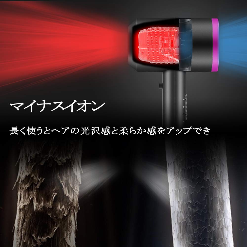 マイナスイオン:ヘアケアイオン放出出来、ヘアの潤いさをアップしながらその乾燥感を改善できる。長く使うとヘアの光沢感と柔らか感をアップできる。