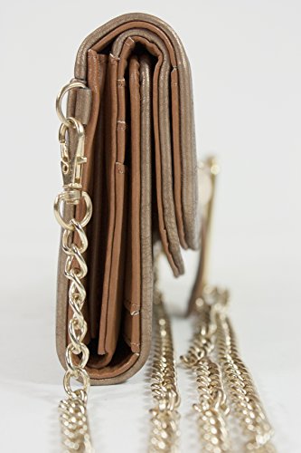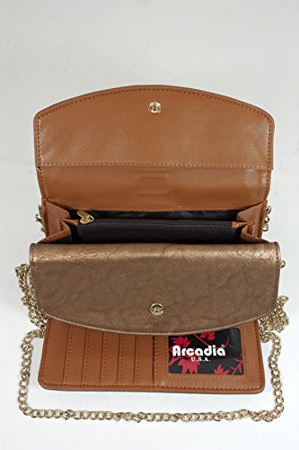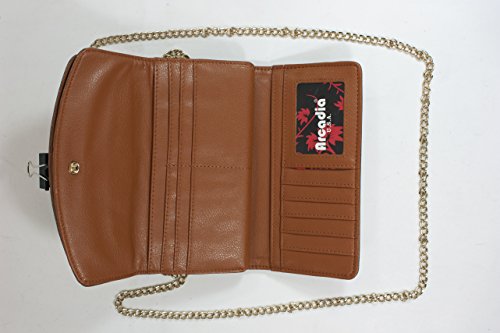 Arcadia Fashion Tri fold Wallet Features 100% leather like Material (PU Leather) And Metal Accessories. Turn Lock Access to bi fold Area with multiple Card Slots And A Clear I.D Slot. An Additional Zipper Pocket For More Space. Length 7.5 Height 4 Width 1.5 inches.