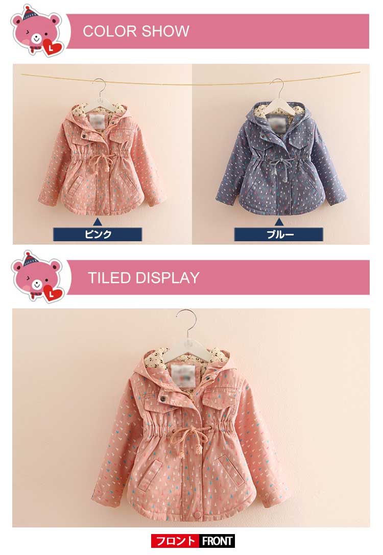 100着丈41 バスト80 肩幅31 袖丈36110着丈44 バスト84 肩幅32 袖丈39120着丈47 バスト88 肩幅33 袖丈41130着丈50 バスト92 肩幅34 袖丈44140着丈53 バスト96 肩幅35 袖丈47150着丈55 バスト98 肩幅36 袖丈50単位:cm1-3cm誤差あります