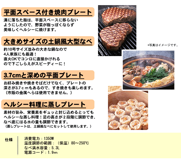 鍋料理はもちろん、すき焼き・おでん・お好み焼き・焼きそば・焼肉に加え、蒸し料理までこの鍋1台で楽しめます!大きい鍋なので4人家族にピッタリ☆食材の彩り、だしの色が映える土鍋風のなべで食欲がそそられます。溝つき焼肉プレートでは、お肉の余分な脂を落としヘルシーに焼けます。溝に落ちた脂は、野菜を焼く平面スペースに移らない構造になっています。