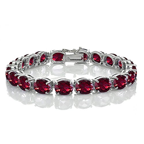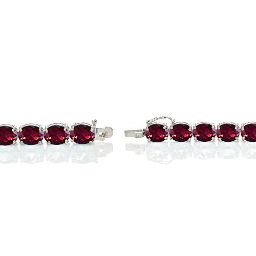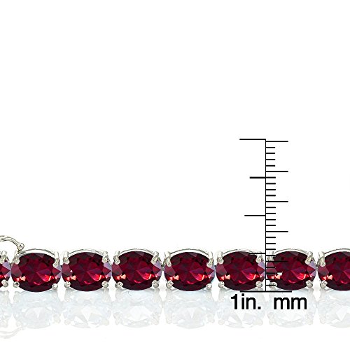 This classic tennis bracelet features oval 9x7mm created ruby gemstones that are set on sterling silver. It secures firmly with a box and tongue safety latch.