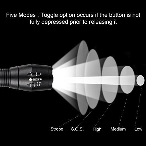 ✓5 LIGHT SWITCH MODE: high / medium / low / strobe / sos; Adjustable focus range for different usage.The button is not fully pressed prior to releasing it to change the modes on this flashlight.