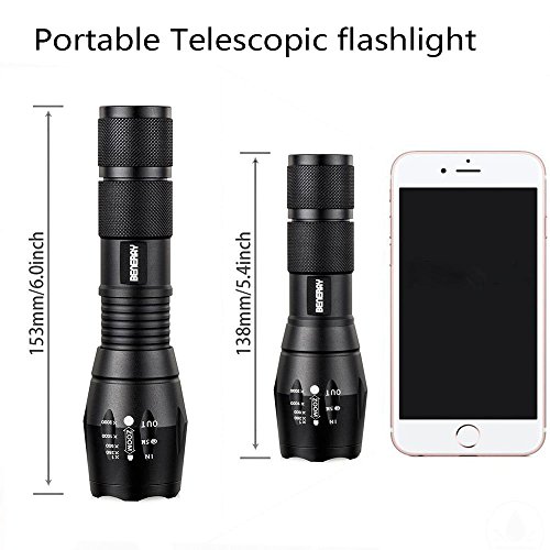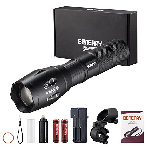 LED Tactical Flashlight,1000 Lumen Portable Zoomable Adjustable Focus 5 Modes Water Resistant Outdoor Torch-Rechargeable 18650 Battery and Charger Included + Bicycle Flashlight Holder Mount by BENERAY