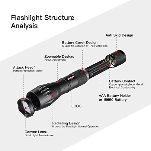 ✓ TACTICAL FLASHLIGHT BODY MADE OF ALUMINUM ALLOY: Anti skid and waterproof 、anti abrasion coating ,lotus shape attack top can protect the lens and break glass in emergency , ultra transparent glass lens, anti reflective ;flashlight LED tactical best suitable for outdoor camping, hiking, climbing, cycling etc
