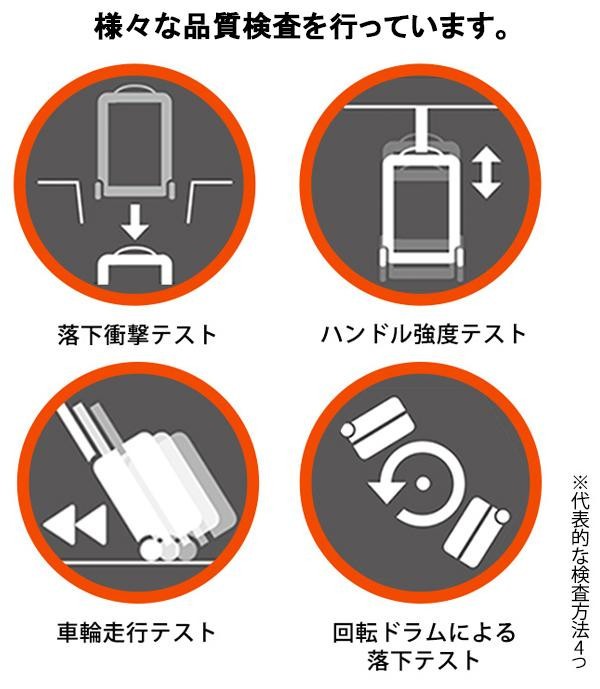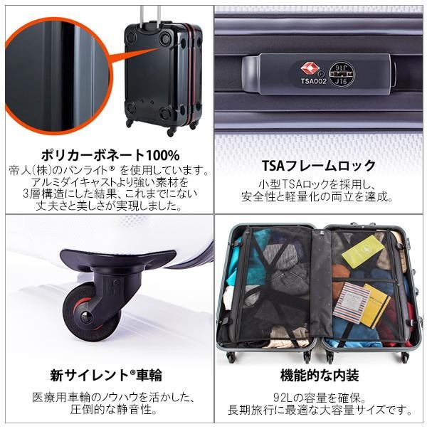 便利なスタッキング(積み重ね)機能がついたスーツケースです。四隅に設けられたポイントは、床置きした際にボディを傷つけにくくします。大容量の92Lで、かつ一般的な航空会社の預け荷物無料の上限である158cmで設計。キャスターは医療用キャスター(搬送用のストレッチャー)のノウハウで開発された、日本設計のものを使用しています。 |