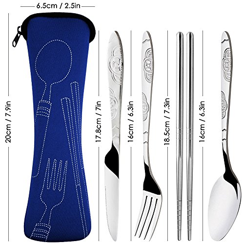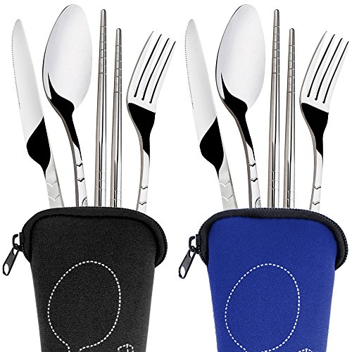 8 Pieces Flatware Sets Knife, Fork, Spoon, Chopsticks, SENHAI 2 Pack Rustproof Stainless Steel Tableware Dinnerware with Carrying Case for Traveling Camping Picnic Working Hiking(Dark Blue,Black)