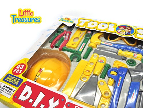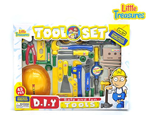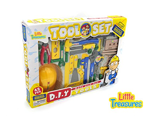 Studio : Little Treasures Publisher : Little Treasures Binding : Toy Product Description The game includes 43 tool toy parts for realistic pretend play - mock hammer, wrenches, pliers, screws, screwdrivers, shovel, costume helmet, accessory stand and many more toy tools imitating mechanical heavy task. The toy set is full of various, distinctive colors - yellow, blue, green, red and brown in prominence appear positively attractive. The game involves many kinds of stories to it with simulating toy parts that indulge the little ones in a creative, pretend play which is extremely realistic to the fantasy-oriented minds. The kids learn the usage of several elements, obtain the gist of utilization and learn the roles of the toy parts that they shall use in their later life, at some point. Festively colored parts and unique features add immense fun and creative play to the game. Real, appealing colors and tones attract the little ones extensively, allowing them to indulge in the toy game of fun, pretend play. The toy parts are manufactured with top quality materials and components, which are non-easily broken or dented. Strong, durable and excellent quality, along with being waterproof invites usage of all kinds; rash, anxious treatment of eager kids is perfectly compatible with the toy parts. This realistic game set for kids allows a creative learning outcome in the most entertaining manner imaginable. It teaches pretend play of tools and elements that are occupied in everyday life, inculcating within the preschoolers a game discipline that can be implemented in later life. The toy beautifully packaged in a toy box, and guarantees hundred percent satisfaction and entertainment within the kids of all ages, where hassle free refund is also provided upon return of the play set for any reason. 0