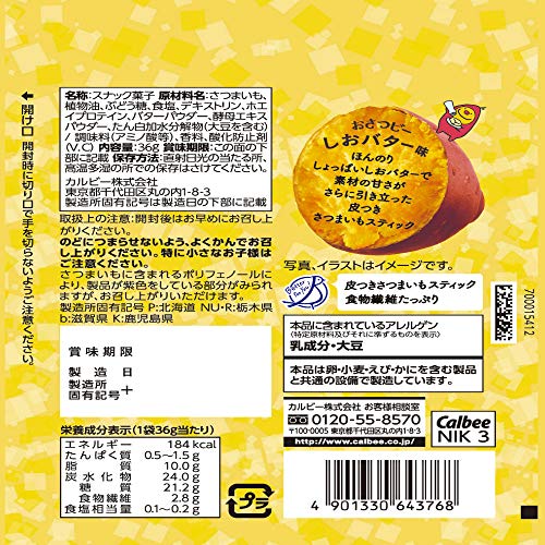 原材料:さつまいも、植物油、ぶどう糖、食塩、デキストリン、ホエイプロテイン、バターパウダー、酵母エキスパウダー、たん白加水分解物(大豆を含む)/調味料(アミノ酸等)、香料、酸化防止剤(V.C)