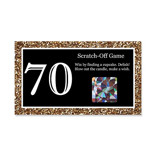 -. Feature : Adult 70th Birthday - Gold - Birthday Party Game Scratch Off Cards - 22 Count / Each game has 2 "winner" cards and 20 "loser" cards / Cards measure 2.75" tall x 4.75" wide / Cards are P.R.Inted on heavy card stock with the game on the front and a pattern on the back. Made in the USA / Please note, this is faux glitter - it's P.R.Inted to look like glitter, but it is not real glitter.