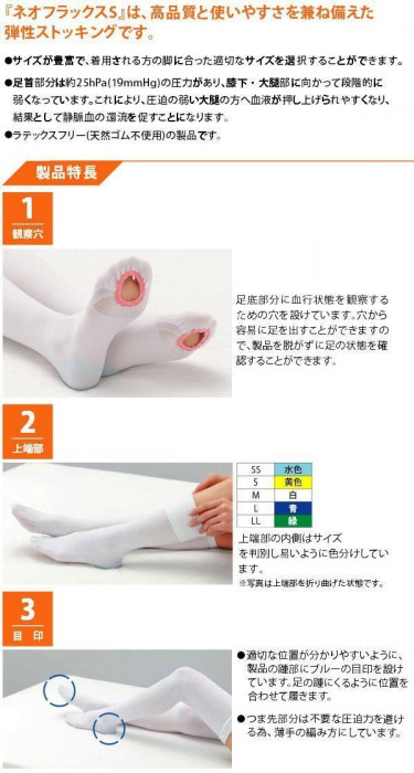 脚部の血行促進を目的とした弾性ストッキングです。 製造国:アメリカ 素材・材質:ナイロン、ポリウレタン 仕様:一般医療機器:弾性ストッキング届出番号:13B2X00187000003 メーカー名:ハクゾウメディカル(株)洗濯機可(ネット使用) ※サプライヤー直送品  ご注文後、当日~1営業日後の出荷となります【商品名】ハクゾウ ネオフラックスS ハイソックスタイプ 弾性ストッキング レギュラー LL・2700124