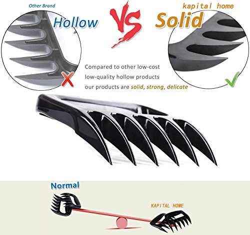 ●【SOLID CONSTRUCTION]:KAPITAL HOME MEAT CLAWS is solid fork, not hollow prongs,other cheap made claws is flimsy built,with hollows within prongs.The BBQ Meat Claws with 6 powerful prongs on each claw for a rapid and condsistent shredding motions in just a few seconds--much more effective than standard meat forks