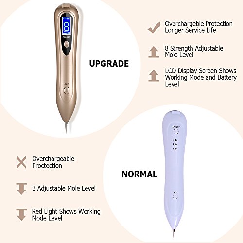 - UPGRADE VERSION: Herwiss mole removal pen built in 8 level strength adjustment for different skin tolerance. Convenient USB charging for protection longer service life. Working mode and battery level can be observed visually on LCD Display, helps you control the machine better.