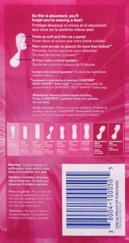 Studio : Carefree Publisher : Carefree Binding : Health and Beauty Product Description Carefree Acti-fresh liners, designed to deliver the ultimate freshness throughout your day thanks to a new core that’s 40% thinner and proven to absorb 2x more than before.* New Carefree Acti-fresh liners have an 8-hour odor control system so all you feel is freshness. Super absorbent to lock fluid away. Our unique process results in a thinner, more absorbent liner that feels as soft as your panties. The fibers in Acti-fresh liners' cover are bonded together like fabric to give you a soft, cotton-like feel that moves with you.*Compared to previous Carefree Body Shape Regular 0