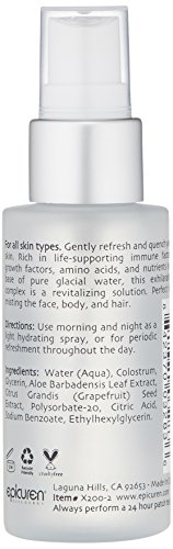 ReleaseDate : 2017-07-14 Studio : Epicuren Discovery Publisher : Epicuren Discovery Binding : Health and Beauty Product Description Gently refresh and quench your skin. Rich in life-supporting growth factors, amino acids, and vitamins in a base of pure glacial water, this exhilarating complex is a revitalizing solution. The Colostrum used in Epicuren products is collected from pasture-fed, healthy, pesticide, hormone, and antibiotic-free cows, by means of an exclusive extraction and filtration process, using purely ethical and humane methods and practices. No animals are harmed during this process. 0