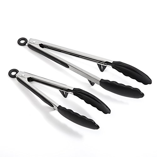 Kitchen Tongs,J&C Life Nonstick Stainless Steel with Stand and Silicone Tips Food Tong Set,Salad and Kitchen Serving Tongs 2 Pack(9 Inch and 12 Inch),Black