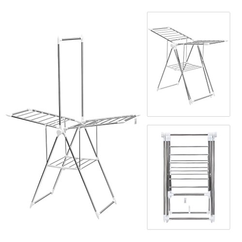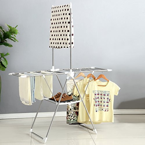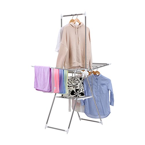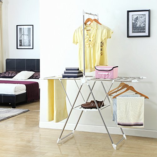- WELL DESIGN DRYING RACK: a tall vertical drying bar is designed for hanging shirts or pants; 2 wings either hang or lay flat your delicates so as to keep them away from wrinkling; a bottom shelf provides additional drying space for socks and more