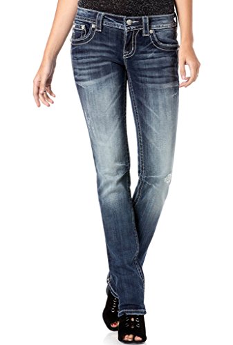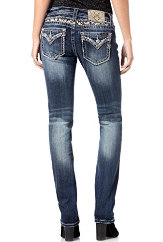 Embroidered back yoke and flap pocket straight leg jean with rhinestone accent embellishments
