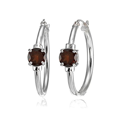 These attractive 25mm hoop earrings feature 6mm solitaire gemstones in a polished setting. These hoops for women and girls are 2mm thick and are secured by post with snap-down backs. The earrings are crafted of fine sterling silver.