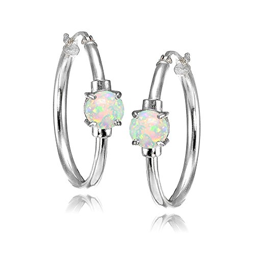 FEATURE - These attractive 25mm hoop earrings feature 6mm solitaire simulated white opal gemstones in a polished setting.
