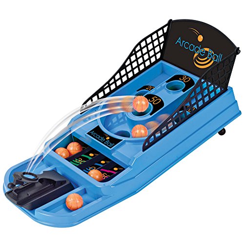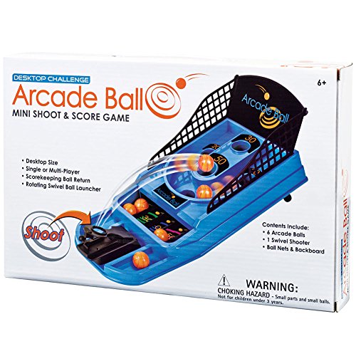 Desktop Arcade Ball Game is for one or more players, and features rotating ball launcher, and score-keeping ball return. Includes 6 arcade balls, nets, and backboard.