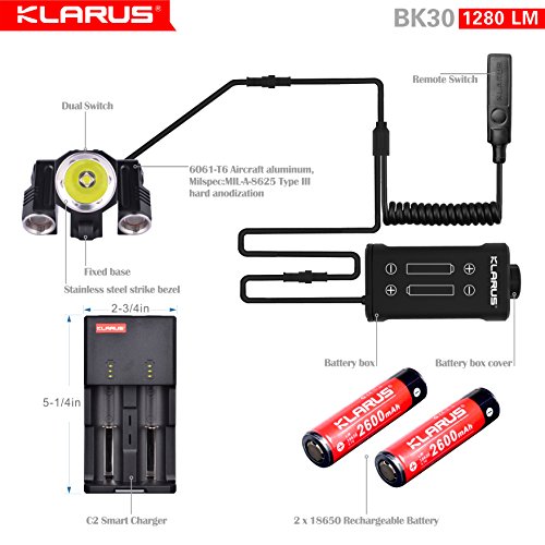 -. Title : Newest Design Bundle: KLARUS BK30 1280 Lumen, Adjustable Triple Head LED Bikelight, Main light CREE XM-L2 U2, side lights CREE XP-G2, Tools Free, with C2 Charger & two 18650 Rechargeable Batteries
