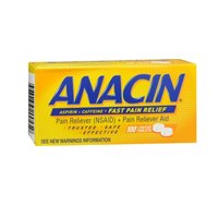 -. Feature : 400 mg Aspirin + 32 mg Caffeine = Fast pain relief. Trusted, safe, effective. / Anacin Fast Pain Relief Tablets For the temporary relief of minor aches and pains associated with headache, cold, muscular aches, backache, toothache, premenstrual and menstrual cramps and the minor pain of arthritis.