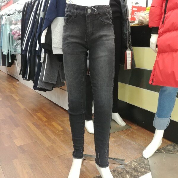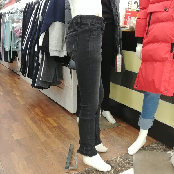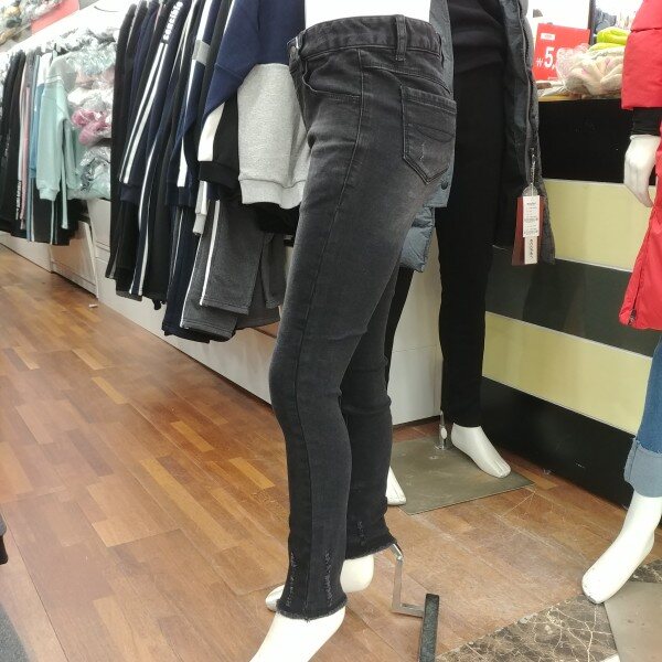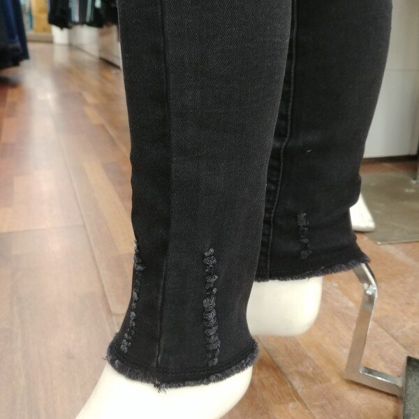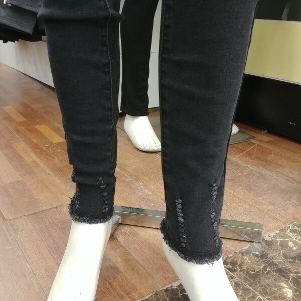 반기모 블랙 청바지입니다.바지 끝 단의 스크래치 디자인이 포인트 입니다.스키니 핏이 며 신축성도 좋습니다.길고 마른 체형에게는 기본 사이즈로 접어 입으셔도 무방한 디자인입니다.기본 체형이시라면 한 사이즈 크게 입으셔도 좋습니다.