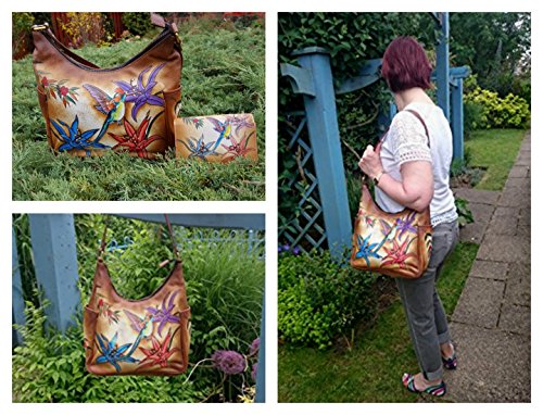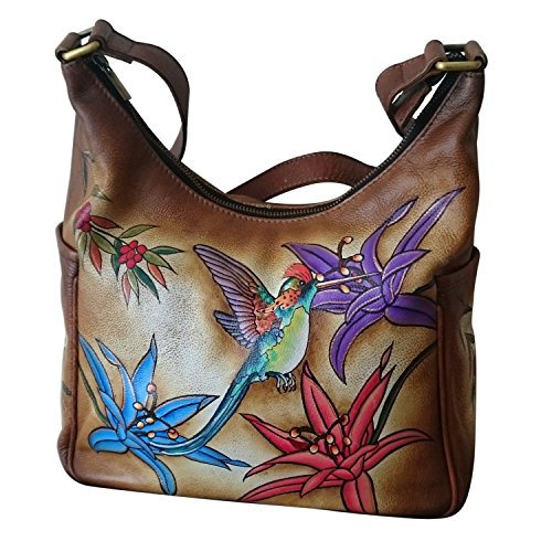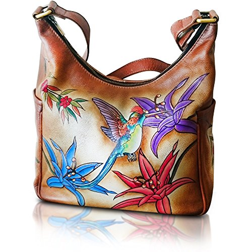 EXQUISITE HAND PAINTED ARTWORK. This Vibrant one-of-a-kind designer leather purse is handmade and hand-painted., Beautiful colorful Hummingbird and exotic Paradise flowers on tan brown exceptional quality leather. Each bag is an individual masterpiece. MATCHING WALLET AVAILABLE : B01L2YHOC4