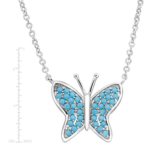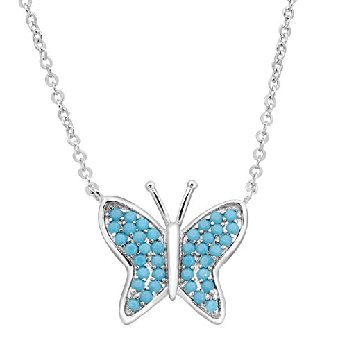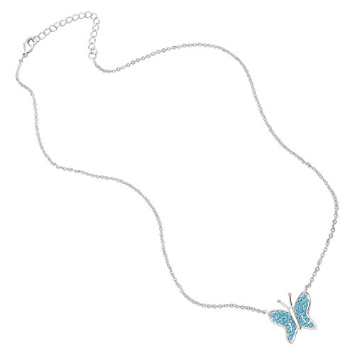 Let your style fly free with this unique butterfly necklace! Round-cut teal cubic zirconia cover the butterfly's wings, crafted in rhodium-plated sterling silver. Feature piece measures 11/16 by 11/16 inches with a total length of 18 inches, including a 2-inch extender for adjustable length.Feature
