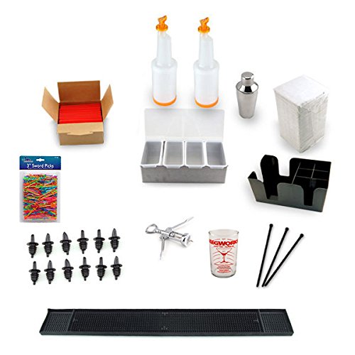 -. Feature : Great starter kit for home bars! / Complete line up of accessories prepares you for drink preparation and service. / Gets you ready to ready to open, pour, measure, mix, shake, garnish and serve most any beverage. / Makes a great gift. / Find tons of great bar accessories at KegWorks!