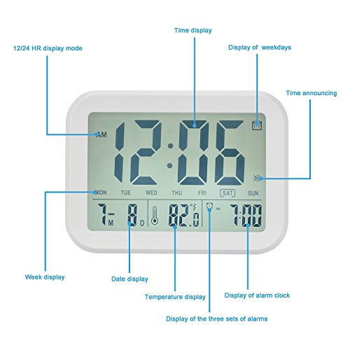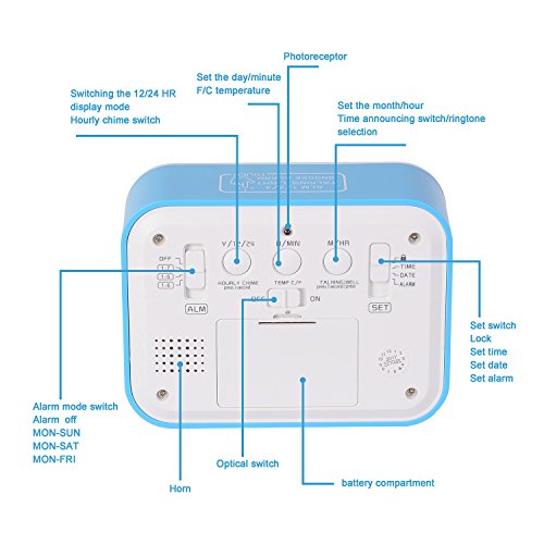 Digital Clock with Hourly Chime, If you need, you can turn on this function, every hour it will tell you the hourly time. The Clock Alarm is a talking clock with smart backlight, 3 alarm modes for working days, 7 kinds of alarm ring.