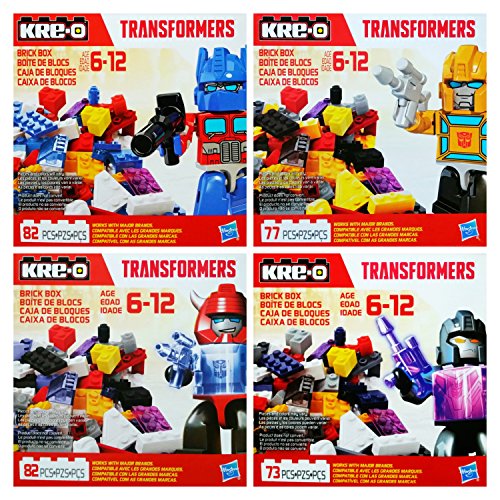 Kre-O Transformers Brick Box Micro Changers Sets: Optimus Prime (82 pcs) , Bumblebee (77 pcs), Cliffjumper (82 pcs) & Barricade (73 pcs) Brick Boxes (1 of Each). ---------- Create it with Kre-O construction sets. Use your imagination to build exciting designs with the colorful plastic bricks and other building pieces, then launch into great adventures with the miniature Kreon figures that are included in the sets. Kre-O construction sets bring you some of your favorite movie, television and game worlds in a whole new dimension of fun and adventure as you construct vehicles, robots, buildings or other designs with these easy-to-attach pieces. Kre-O construction sets put the power of building play in your hands. Create it with Kre-O.