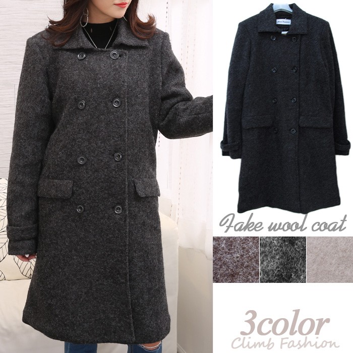 【デザイン】ゆったりとしたシルエットが今年らしいダブルボタンのコート。ベーシックなデザインでデイリー使いに大活躍します。毛足の短い滑らかな肌触りのフェイクウール素材を使用。ニットの上からでも羽織りやすいゆとりのあるシルエット。カラー:ライトベージュ、ダークブラウン、ブラックモデル着用カラー:ブラックモデル身長:160cm原産国:中国製素材:裏地ポリエステル100%、表地ポリエステル100%サイズ:FREE(総丈:95cm/胸囲:54cm/肩幅:43cm/袖丈:63cm/袖口:14cm)