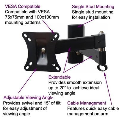 -. Feature : Fits most TVs 15 16 17 19 20 and some up to 32" (check VESA and weight) / Fits VESA 75mmX75mm/100mmx100mm display, 55 lbs weight capacity / Extend Depth From Wall about 20 inch. Swivel +/-90 degrees and tilt +/-15 degrees / Single stud mounting, Cable management / Standard mounting screws included in package