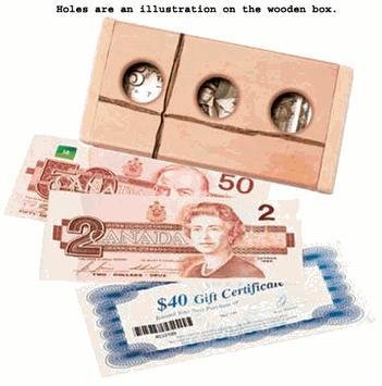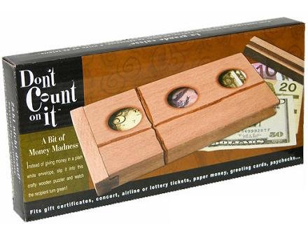 When presenting a gift of money to someone special, replace the usual paper envelope with ''Don't Count On It,'' the special wooden puzzler from Family Games. Just slide your gift into the puzzle, secure it in place, wrap with the raffia string, and hand it over. The recipient can see your gift through the holes in the front of the box, but they'll have have to solve the puzzle to retrive your gift. A humorous gift-giving idea for birthdays, graduations, weddings, showers, family gatherings and holiday celebrations. This clever alternative to the envelope holds standard-size gift certificates, concert and lottery tickets, paper money, coupons, and more. For ages 8 and over. Includes 1 puzzle, plexiglass liner, string, and instructions in 4 languages.Feature