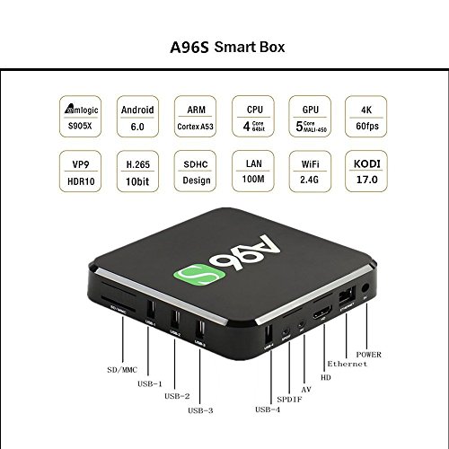 -. Feature : NEWEST SUPER FAST AMLOGIC S905X. The most latest Powerful Quad Core CPU performance for Network Set-top Box. Full Quad core Cortex-A53, up to 2.0GHZ Ultra high frequency, more than 4 times performance improvements. We guarantee you won't miss a minute of your favorite show or movie ever again! / NEWEST ANDROID 6.0 MARSHMALLOW. The most professional and newest operating system of Android TV box.It can be powerfully compatible with plenty of applications.The OTA updating is available to you. / NEWEST KODI 17.0 IS PRELOADED. The most latest version of kodi(XBMC). Say goodbye to the old Kodi. It is also being pre-loaded with more add-ons for you, the majority of free video, films, musics,TV shows, live TV etc are available to you without monthly bills or costs! Why waste your money on cable or movie subscriptions when you can get the exact same viewing pleasure with the NEWEST A96S Android TV Box. / HHIGER DEFINITION SCREEN SENSE. 4K 60fps display, 4K x 2K H.265 hardware video decoder and 4K x 2K output with 10/100Mbps cable network, offering you high definition picture and fluently video playing. It's compatible better with your HD 4K home TV. / TURN YOUR TV INTO A SMART TV! Enjoy truly unlimited options and completely customize your HD viewing experience. With apps like Facebook, Internet Browser, KODI Entertainment Center, , Netfilx, YouTube and more, there is no end to the amount of fun that you can have with your TV now!