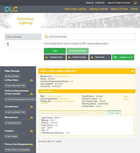✔UL listed E488272 for wet locations and DLC Qualified GKOFD45W27V50KBYB77, operating temperature range -40°F (-40°C) to 122°F (50°C) , 5-year limited warranty. With a 50,000 hour operating life, you can install the fixtures and expect over 5 years of LED life.